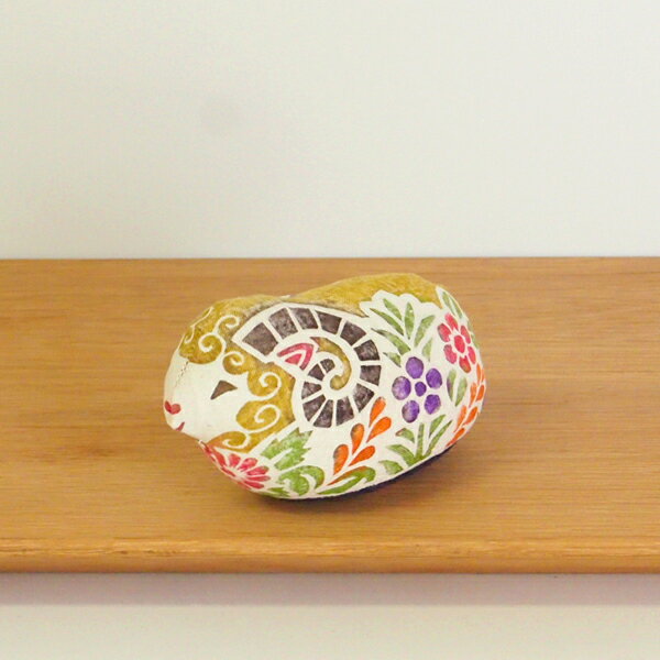 真工藝 木版手染めぬいぐるみ 干支シリーズ・親 未 ひつじ クルクル巻き毛 飛騨高山の工房で作られている、 素朴な味わいが魅力の木版手染めぬいぐるみ。